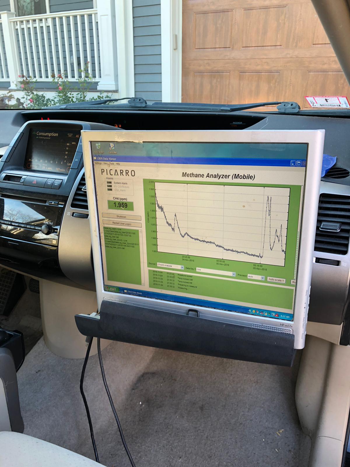 As part of our project we borrowed special monitoring equipment to map the presence of methane in the air in Bedford from two scientists: Professor Nathan Phillips from Boston University and Bob Ackley from Gas Safety USA. The device is called a mobile Picarro Cavity Ring-Down Spectrometer and it works by bouncing a laser off mirrors to measure methane concentrations every second. With the help of our parents as drivers, we covered over 90% of Bedford’s roads and the results can be seen at the Bedford Free Public Library in our display. We also went to several locations in town and used a soil methane monitor to detect methane in areas with gas leaks as reported by the gas company.